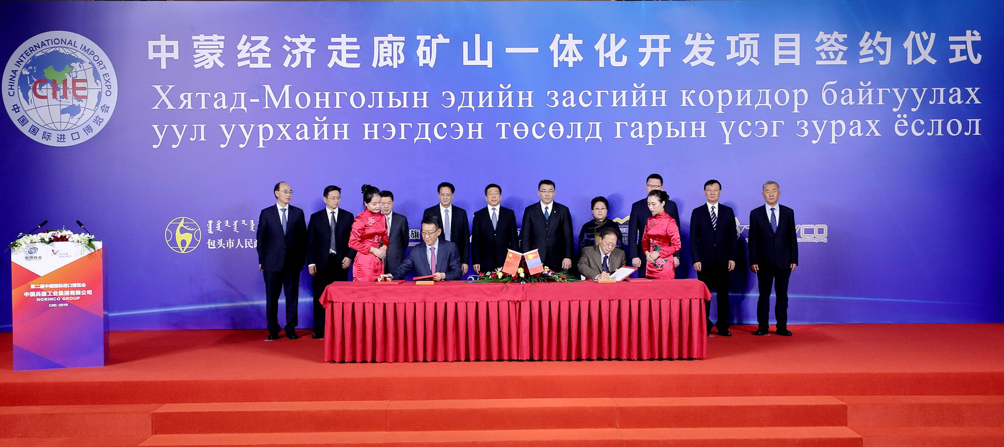 11月4日,第二屆中國國際進口博覽會開幕前,在中國兵器工業集團有限公司董事長焦開河和蒙古礦業與重工業部部長蘇米亞巴扎爾·道古蘇仁、國務院國資委副主任任洪斌、內蒙古自治區副主席艾麗華的共同見證下,中蒙經濟走廊礦山一體化項目在上海簽約。簽約前,各相關方進行了友好會談。